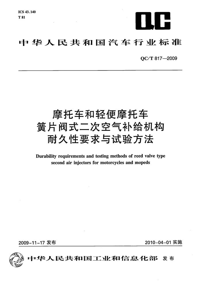 《摩托車和輕便摩托車簧片式二次空氣補給機構耐久性要求與實驗方法》QCT817-2009