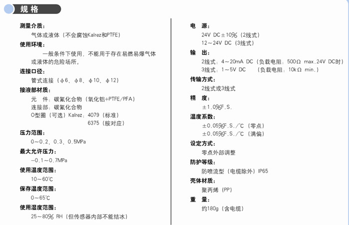 該產品接液部表面采用了碳氟化合物,最大程度洗脫金屬離子。EMC耐久性保證(已取得CE認證),適用于半導體制造裝置中純水、藥液和泵的壓力監測。
