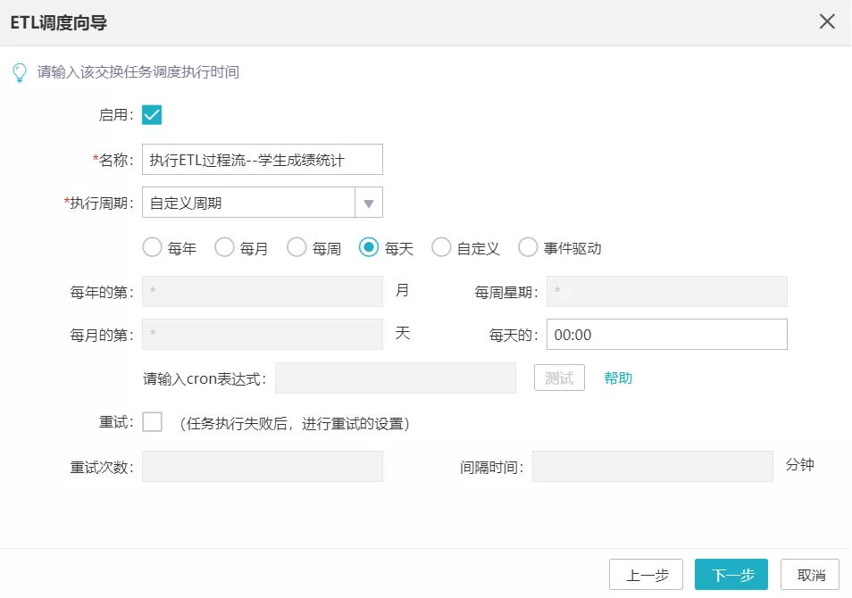 一般情況下,ETL過程都會伴隨著調度任務的設置。比如,某銷售部門需要每周五抽取數據計算當周銷售利潤用于匯報,如果利用ETL實現,時間調度管理必不可少。億信ABI的ETL調度導向,深度考慮各使用場景,用戶只需簡單操作,即可實現復雜的調度任務。