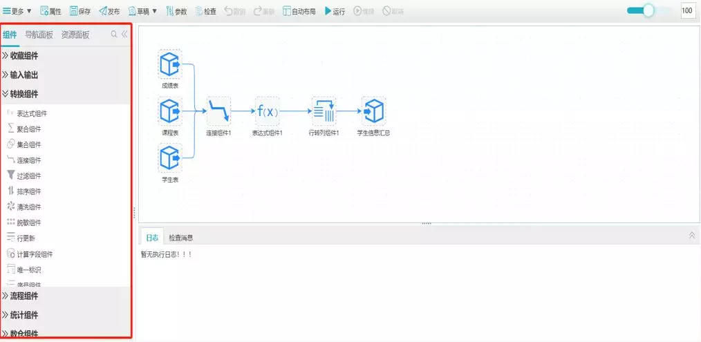 億信ABI中內置組件包括:輸入輸出組件、轉換組件、流程組件、統計組件、數倉組件、腳本組件、大數據組件等。