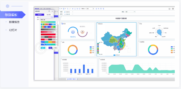 隨著互聯網思維的深化,如市場、財務、銷售、運營等越來越多的崗位,都開始重視并自發性的開始了解并學習數據分析,來引導幫助決策。真正的數據分析,應該完全面向業務,響應業務人員各種腦洞大開的思路,任由其隨心所欲探索數據價值。例如,運營制定用戶活躍度模型,監控用戶的成長以及復購和轉化,以至精細化營銷;人力資源制定效能儀表盤,去實時掌握人員狀況和人均效能,通過對招聘漏斗的分析促進招聘效果提升。 一、什么是數據看板? 數據看板允許用戶與數據進行交互,使他們能夠做出數據驅動的業務決策。同時,可以用來追蹤、分析、監控和直觀展示關鍵業務指標,是公司數據驅動的重要工具。公司通過看板監測核心數據、及時洞察業務問題、溝通各部門落地解決方案成為常態。 二、數據BI看板的優勢 1、敏捷決策 數據BI看板只需點擊幾下鼠標,就可以從不同的視角查看數據。放大、縮小、篩選要素、選擇時間間隔、顯示或隱藏不需要的特定參數。能夠以前所未有的方式查看數據,幫助決策者使用企業最新的數據來做分析。 2、實時監控 業務發展速度對于任何想要在殘酷的數字時代生存下去的公司來說,是至關重要的因素。使用傳統的Excel或PPT時,數據每更新一次都必須要手動更新報告。而商業智能的核心在于,數據BI看板可以支持實時數據。 3、提高效率 隨著互聯網發展速度越來越快,收集并需要分析的數據量在不斷增長。雖然靜態報告已成為可靠的工作助手,但使用Excel的處理大量數據依舊顯得很吃力。而使用數據BI看板,不僅可以更迅速地處理數據,還能提高生產力。 4、節省資源 因為對數據庫查詢或自定義的需求數量大大減少,不僅IT部門能夠專注于其他更緊迫或有價值的任務,而業務人員也可以快速獲得問題的答案。讓用戶自主執行數據分析,可以幫助公司節省寶貴的IT資源。 三、如何搭建數據BI看板 本文給大家介紹一款國內簡單又好用的數據分析產品-億信ABI。它億信華辰自主研發的一站式數據分析平臺。它提供了從數據導入、數據預處理、自動建模和數據可視化分析于一體的完整的解決方案。業務人員可以僅僅通過拖拽幾下鼠標便完成基本數據查詢到數據可視化的流程。 靈活的數據預處理 對于接入系統的數據,通過點選式的方式進行去除重復行、空值替換、數據裁剪、數據脫敏、類型轉換等復雜的數據處理操作,并且能進行圖形化界面多表關聯。 百億數據秒級響應 支持基于列存儲的MPP架構的分布式數據庫進行敏捷分析,百億數據可達到秒級響應,給用戶帶來極致的產品體驗,可解決TB甚至PB級超大數據量敏捷分析的難題。 豐富的可視化展示 支持敏捷看板,即席報告,幻燈片等多種分析方式,使數據分析更貼近用戶應用的場景。并且提供多種可視化組件:表格、常規統計圖、html5統計圖、地圖等。 分分鐘制作敏捷看板 支持靈活的自由式布局、組件化的統計圖、豐富的數據統計函數、靈活的篩選功能、智能的圖表聯動,用戶只需通過簡單的拖拉拽,就可以快速地制作出一張敏捷看板