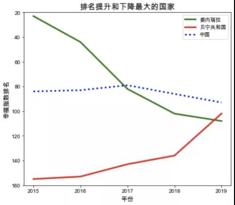 由可以看出,在所有國家中,幸福指數(shù)排名上升最快的國家是貝寧共和國,2015年到2019年間,從155升至102。而下降最快的是委內(nèi)瑞拉,世界排名從23驟降到108。中國的變化較為平穩(wěn),一直處于80~90名左右。經(jīng)過查閱相關(guān)資料可發(fā)現(xiàn),近年來委內(nèi)瑞拉經(jīng)濟崩潰,通貨膨脹嚴重,民不聊生,食不果腹,因此其幸福指數(shù)必然暴跌。