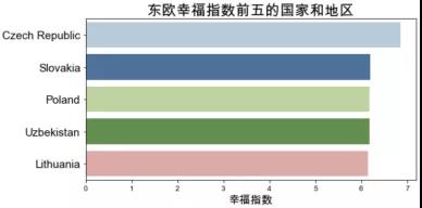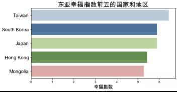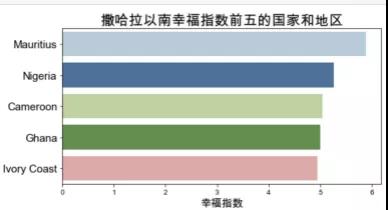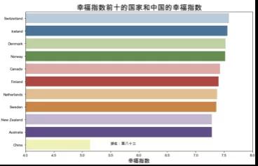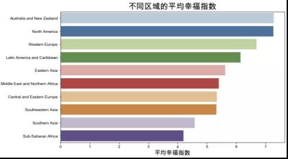 基于2015年的數(shù)據(jù)。將各區(qū)域的國家的幸福指數(shù)加總并計算平均值后,得到各區(qū)域的平均幸福指數(shù)。澳大利亞和新西蘭、西歐以及北美的平均幸福指數(shù)最高,幸福指數(shù)最低的三個區(qū)域是東南亞、南亞和撒哈拉以南的非洲地區(qū),對比中國與幸福指數(shù)前十的國家,可以看到中國的幸福指數(shù)排名為世界中游水平。