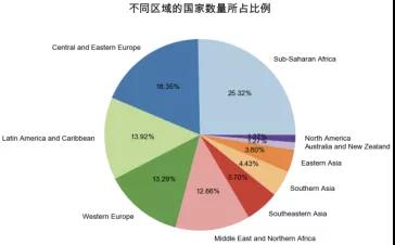 全球所有國家可分為十個區(qū)域,包括撒哈拉以南非洲、中東歐、拉丁美洲和加勒比、西歐、中東與北非、東南亞、南亞、東亞、澳大利亞和新西蘭以及北美。如圖所示,其中撒哈拉以南的國家眾多,占到總數(shù)的25%左右,大洋洲只有澳大利亞和新西蘭,而北美只包括美國和加拿大。