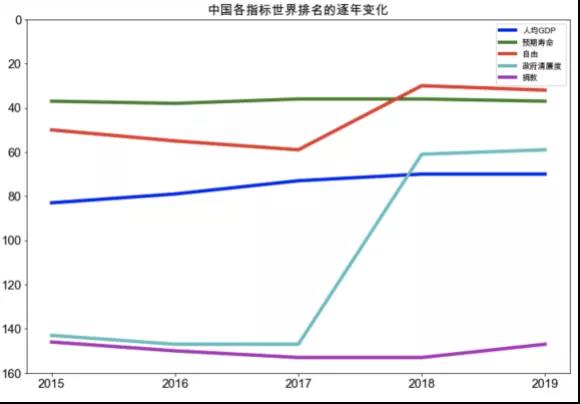 對過去五年的中國在各指數(shù)上的全球排名的變化可以發(fā)現(xiàn),預期壽命基本保持不變,人均GDP緩步上升,政府清廉度急速上升,捐款狀況在低位徘徊,人民自由先降后升。可以反映出,我國的反腐斗爭成績喜人,經(jīng)濟建設(shè)還需努力,民生醫(yī)療建設(shè)成果要繼續(xù)保持,為了更好的發(fā)展,我們需要更高質(zhì)量的自由。