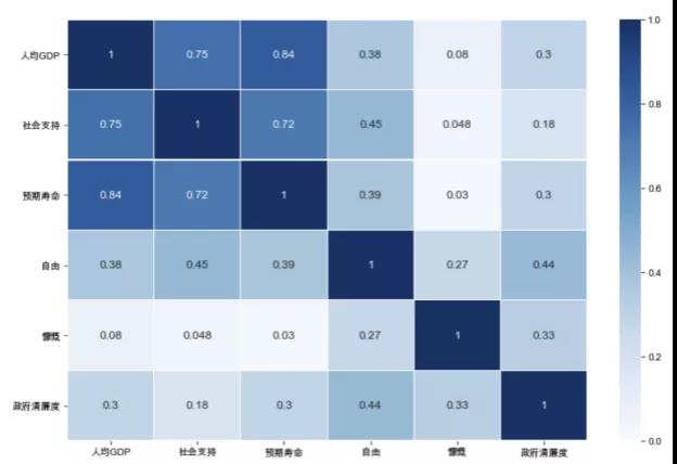 上述的結(jié)果表明,經(jīng)濟可能對預期壽命和社會支持都有很強的影響,自由在一定程度上會影響其他因素,而捐款和政府的清廉程度與其他因素的關(guān)系并不明顯。