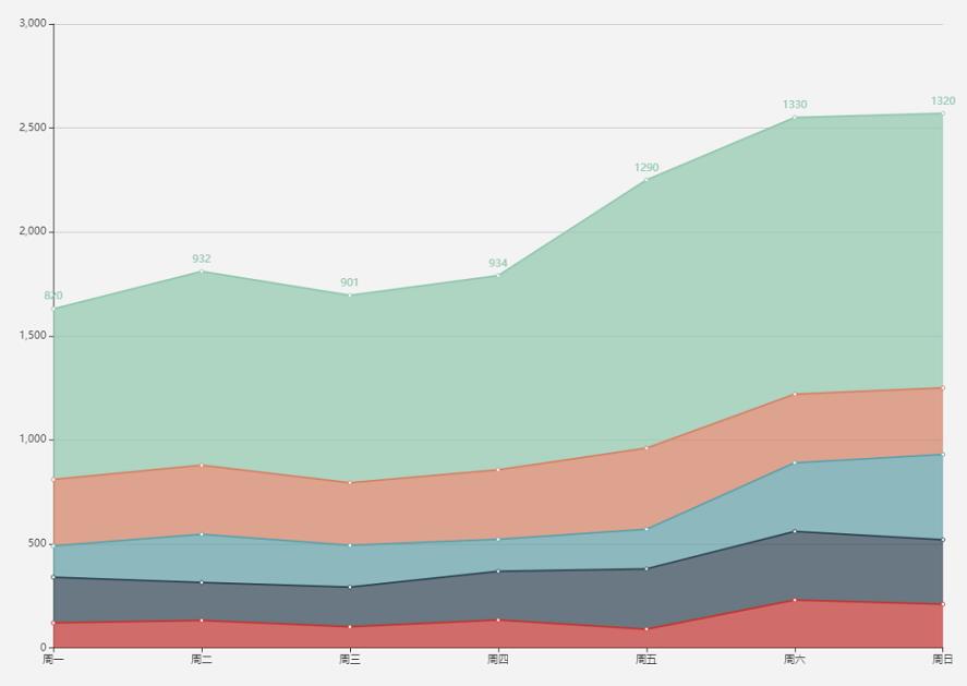 常規面積圖適合表現總量和分量之間的關系,比如總量是總用戶量,而分量是各個渠道的用戶,那么選用面積圖較為合適