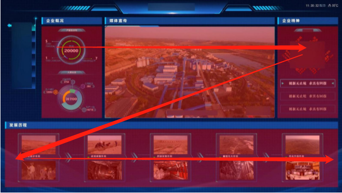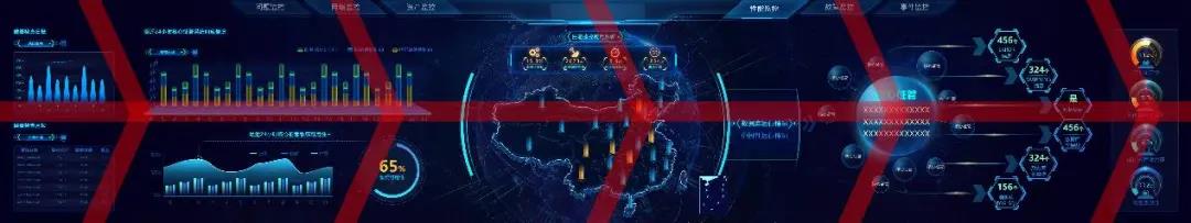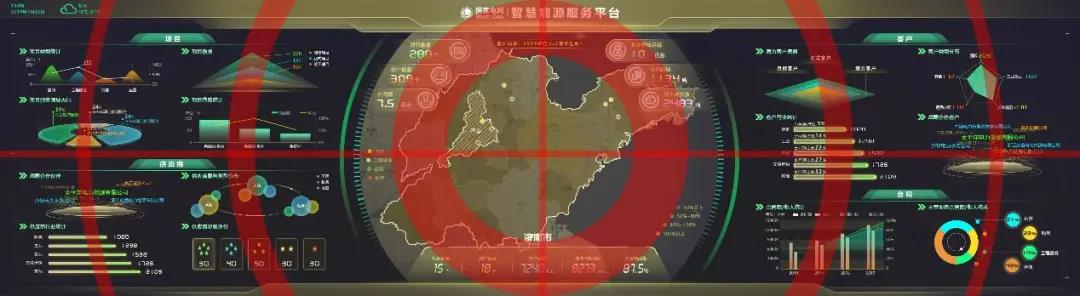 再者,設計人員需要明確大屏的視覺路線即展示路線,這條線能講出怎樣的故事跟你的布局構圖密切相關。下面提供幾種常見的構圖思路,希望對大家有所啟發和幫助。 1、中心放射型 以中間核心內容向周圍放射,正中多以地圖和給人視覺沖擊的主視覺為主,起到聚焦凸顯的作用,層次明晰,主次分明。 2、故事線型 該類型主要是依靠建設一條完整的視覺導線,引導觀看者從一端往另一端吸收信息,該構圖簡單易懂,比較適合有嚴格順序的數據信息,例如企業的展示大屏等。 3、數據平鋪型 這是一種最為普遍的構圖手法,一般是將同級別的數據信息一起展示出來,區塊清晰明確一目了然。但即使是平鋪,也是有輕有重,一般以板塊劃分的大小來界定分配。 配色篇亂花漸欲迷人眼